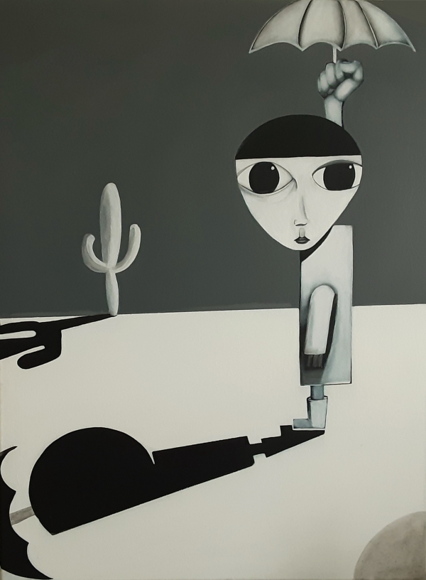 Man standing in the desert underneath his umbrella. Is the umbrella protecting him from the sun or the rain? The answer is unclear we will have to find out. Perhaps the umbrella is protecting him from something else we hadn't thought of!