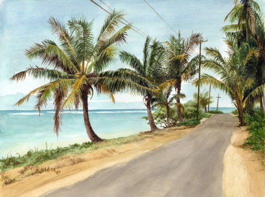 Emily Miller's original watercolors are on exhibit on Kauai at Aloha-n-Paradise Gallery in Waimea, Bamboo Gallery at Na 'Aina Kai Botanical Gardens in Kilauea, and Amy-Lauren’s Gallery in Hanapepe. The artist is available for commission work.