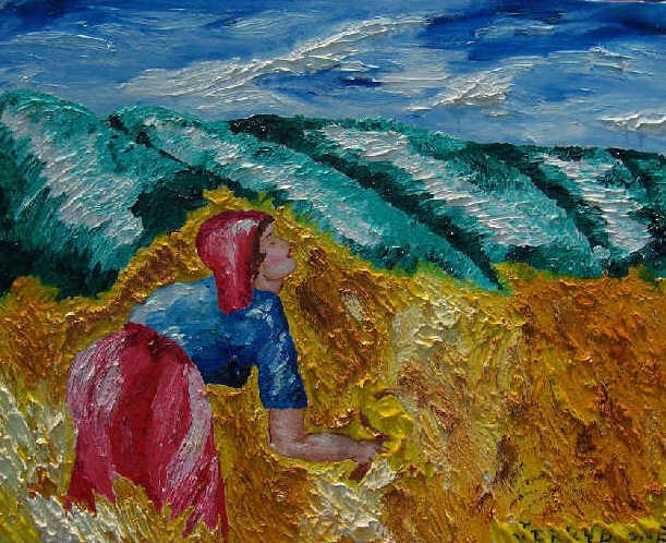 This was a difficult work to do because I had to be in a particular mood to create it. Notice how the clouds, the mountains, and the wheat all seem to be restless. All elements of this painting are in restless motion. All combine to create their own symphony.